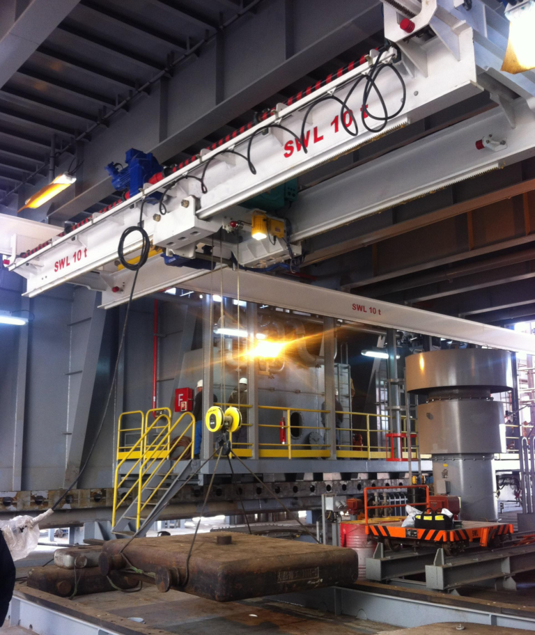 电动双轨机舱行车是一种安装于机舱顶部结构上的轻型桥式起重设备,其核心特点是采用双轨设计,实现吊重物在三维空间内的精准、连续、平稳移动。与传统的简易吊挂或单轨葫芦相比,双轨结构提供了更大的覆盖区域和更灵活的移动路径,使维修人员能够轻松将重型零部件(如缸头、活塞、曲轴等)从设备上拆卸,并精准移运至维修通道或工作平台,极大减轻了劳动强度,避免了设备搬运过程中的磕碰风险。